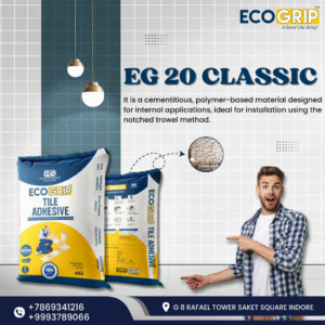 EcoGrip EG-20 Classic is a cementitious tile adhesive engineered for fixing ceramic tiles on floors and walls, especially for indoor use. It offers excellent workability, strong initial grab, and durability—perfect for regular tiling jobs where cost-efficiency meets performance.